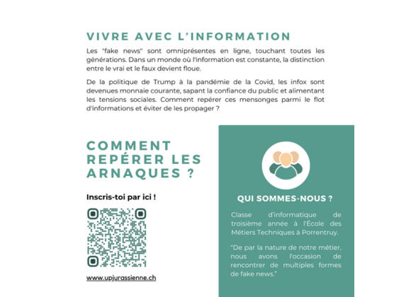 Les conférenciers en herbe sont une classe d'apprentis informaticiens de 3e année à l'Ecole des métiers techniques de Porrentruy. Ils réalisent et présentent cette conférence dans le cadre de leur cours de culture générale. Particulièrement exposés à la désinformation durant leur travail quotidien, ils sont bien placés pour repérer les arnaques et autres infox.